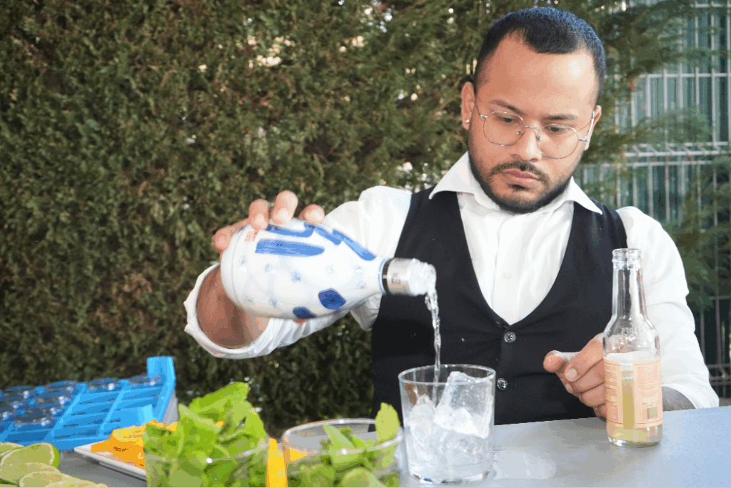 调酒师用汾酒青花30进行鸡尾酒调制表演。