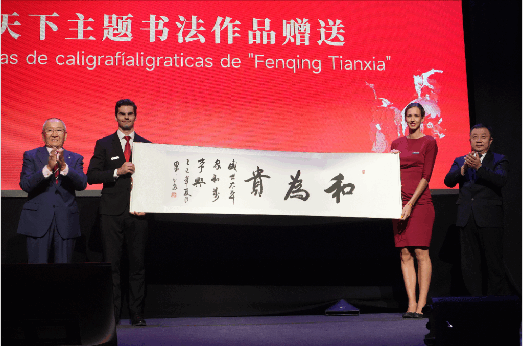 在文化交流环节,中西双方互赠主题书画作品。“汾清天下·伊比风情”、“和为贵”等书法作品寓意深远,展现了中西文化和合共生的理念。